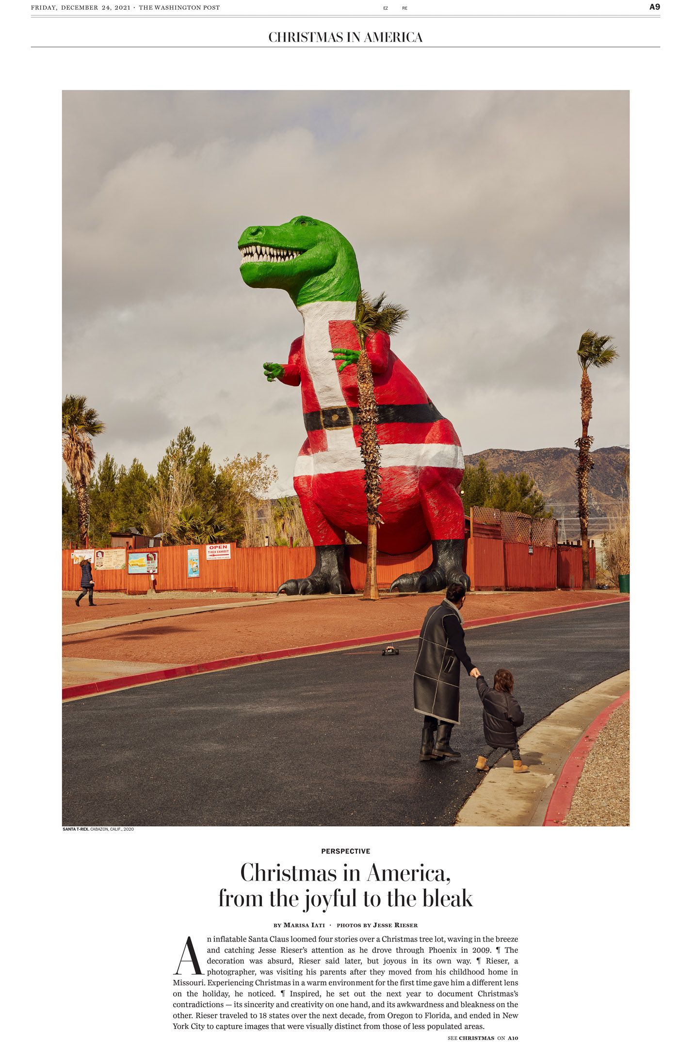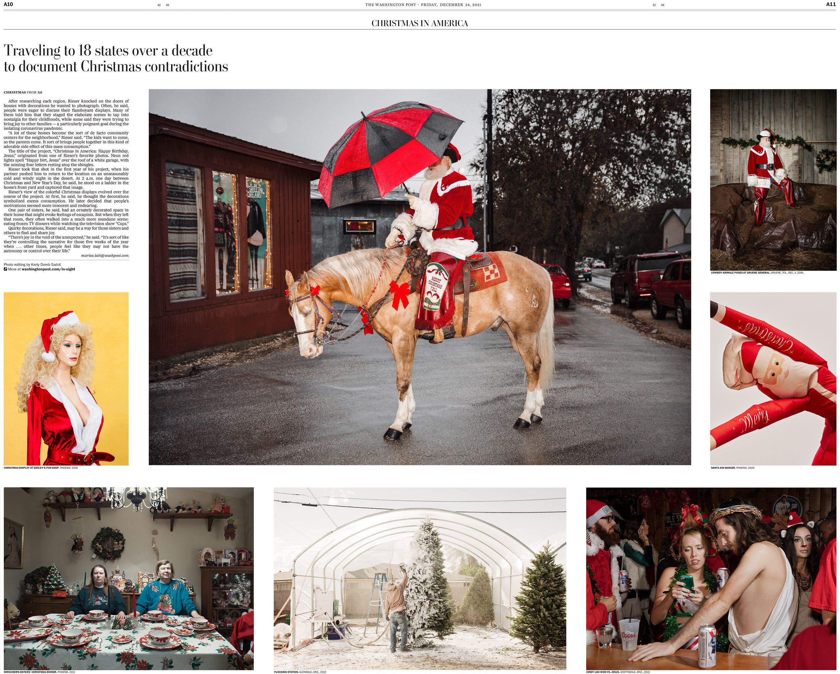 Inspired, he set out the next year to document Christmas’s contradictions — its sincerity and creativity on one hand, and its awkwardness and bleakness on the other. Rieser traveled to 18 states over the next decade, from Oregon to Florida, and ended in New York City to capture images that were visually distinct from those of less populated areas.